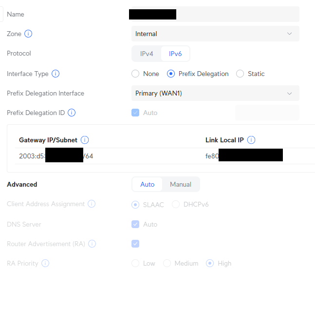 Die Telekom bietet SLAAC an, sodass wir dieses auch direkt nutzen können. Nun delegieren wir die /64 Subnetze weiter an unsere logischen Netze unter „Netzwerke“ in den Einstellungen der Dream Machine: