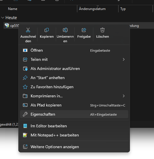 Die Installation und Verwendung unter Windows 11 ist allerdings dennoch möglich. Canon war schon damals gütig und hat vorausschauend die Treiber sowohl für 32bit, als auch 64bit-Betriebssysteme erstellt, was die Chancen eines Erfolgs unter Windows 8/8.1/10/11 enorm erhöht, den Treiber im Kompatibilitätsmodus nutzen zu können. Aufgerufen wird das Kontextmenü des Treiber-Installers: