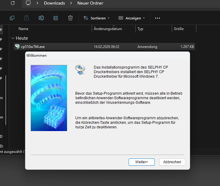 Versucht man den 21 Jahre alten Canon SELPHY CP510, zu dessen Verwendung unter Linux ich bereits hier einen Beitrag verfasst hatte, unter Windows 11 mit dem offiziellen und neuesten verfügbaren Treiber von Canon zu installieren, wird dies nur mit folgender Fehlermeldung quittiert.