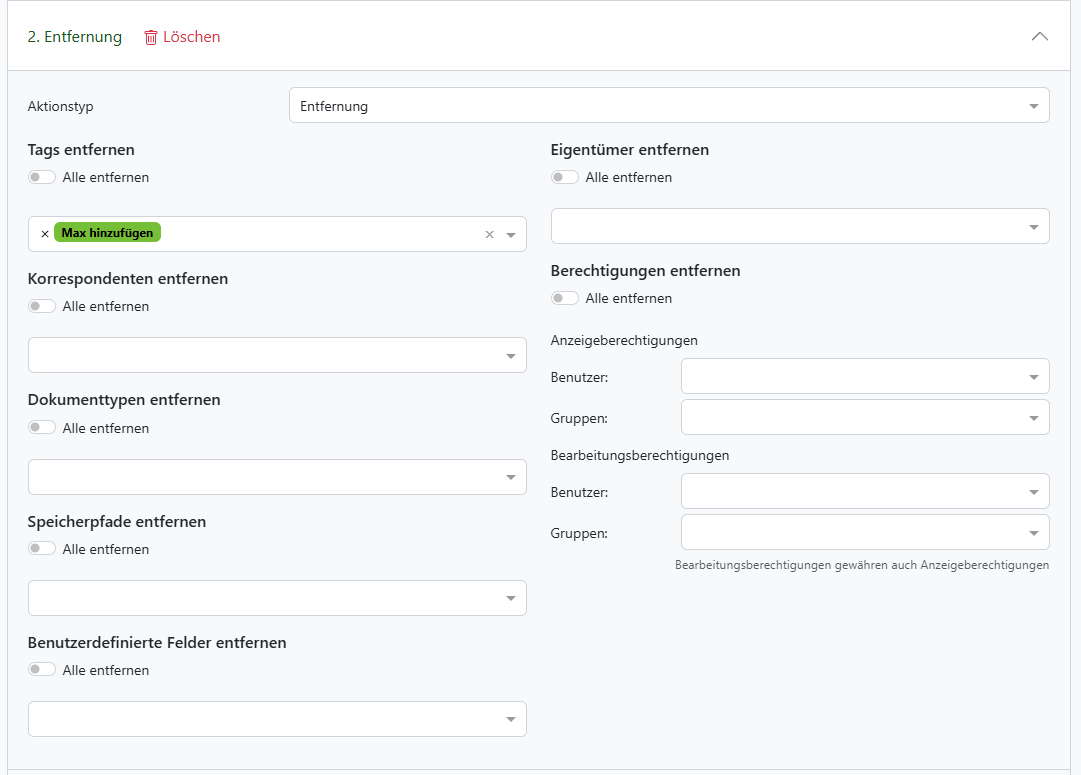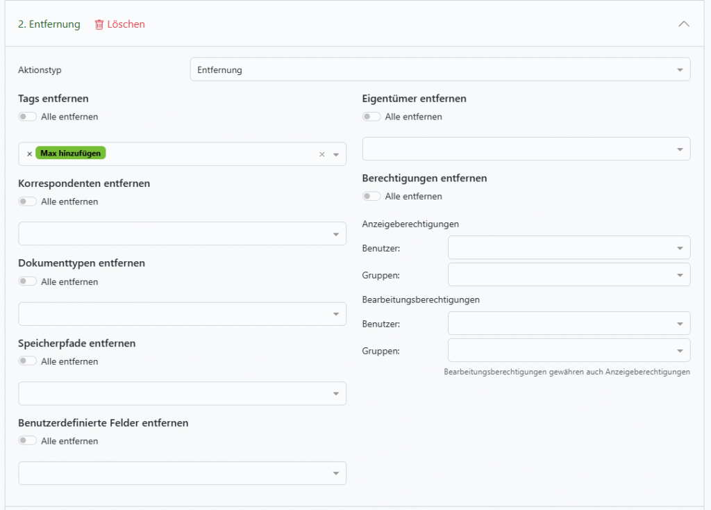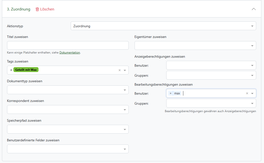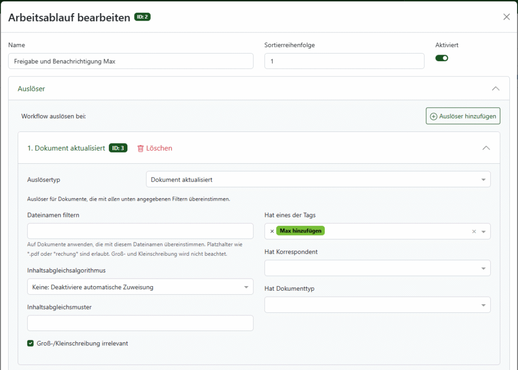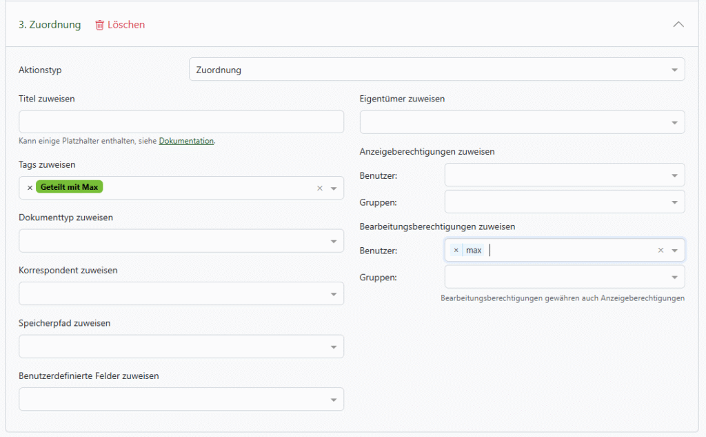 Um nun ein Dokument an den Benutzer „max“ freizugeben, wird das Tag „Max hinzufügen“ zugewiesen und das Dokument gespeichert. paperless-ngx wird nun die Berechtigungen anpassen, die Email verschicken und anschließend das Schlagwort ersetzen. Der Prozess dauert je nach Menge der anderen anstehenden Aufgaben einen Moment.