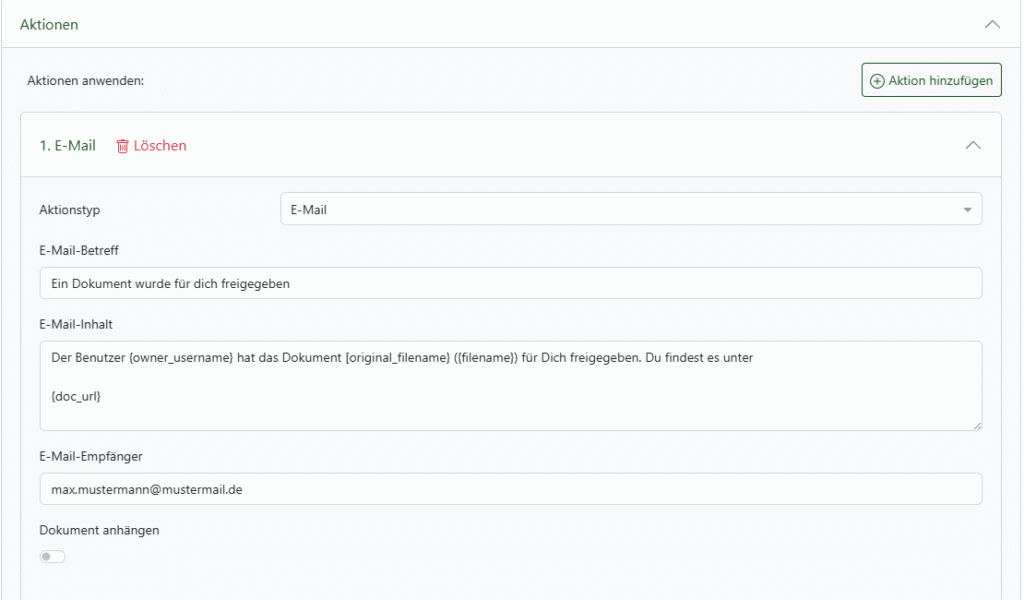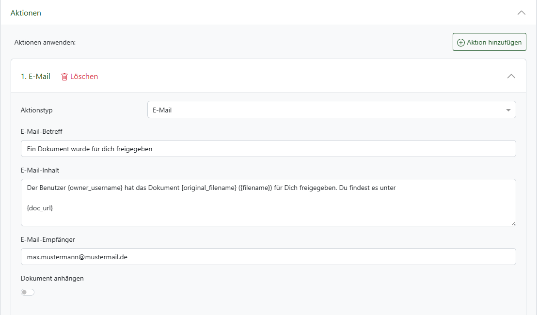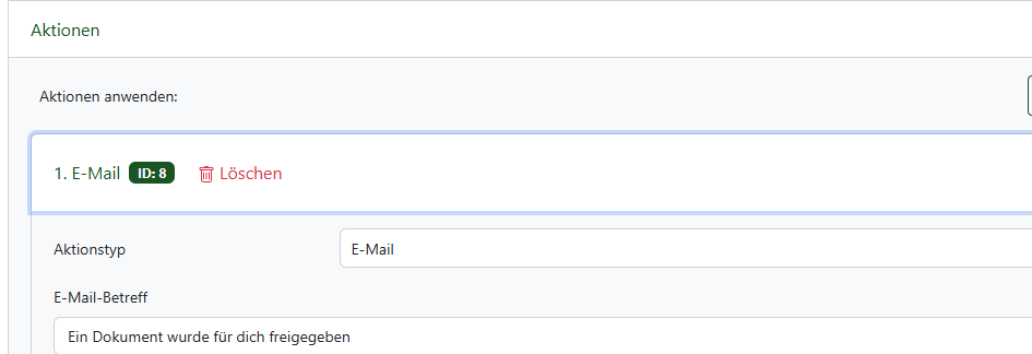 Nach einem „docker compose up -d“ nach der Änderung erscheint die „Email“ Aktion wie folgt: