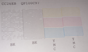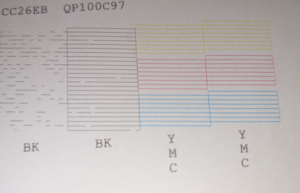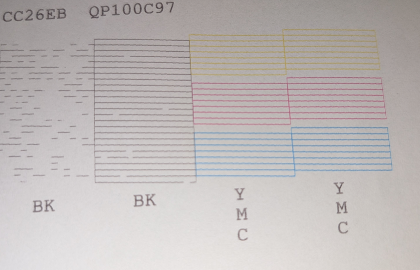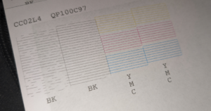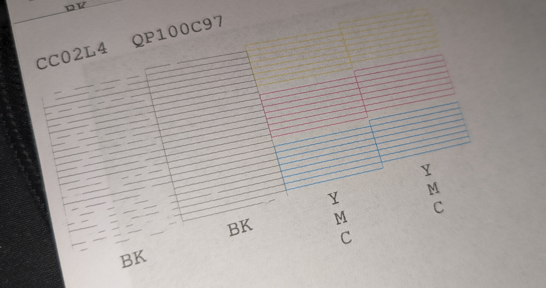 Durch weitere Druckvorgänge von schwarzen Seiten sowie ein paar mehr Reinigungsvorgänge konnte schließlich schon bald schwarze Farbe erkennbar werden. Damit war sichergestellt, dass der Druckkopf überhaupt technisch noch funktionierte und tatsächlich nur verstopft war. Jedoch stellte sich nun das nächste Problem ein: Mit steigender Druckfrequenz wurde die Tintenverfügbarkeit wieder schlechter, es schien, als würde die wahrscheinlich uralte Aftermarket-Patrone nicht genug Tinte liefern und diese nur langsam nachlaufen. Bis hier fiel auf, dass die Patrone 2-3 mal schlicht ausfiel (vermutlich Kontaktverlust des Chips) und auch nur etwas schief in den Patronenhalter passte.