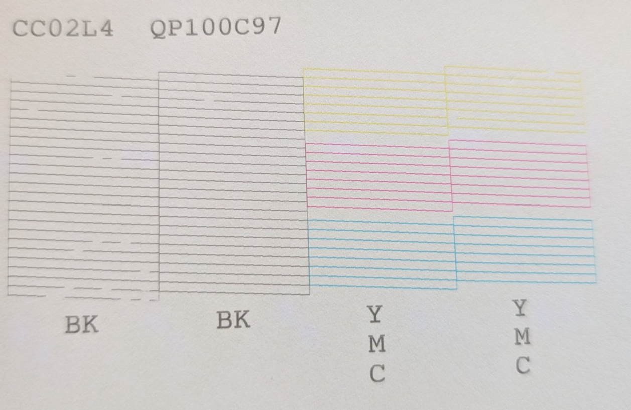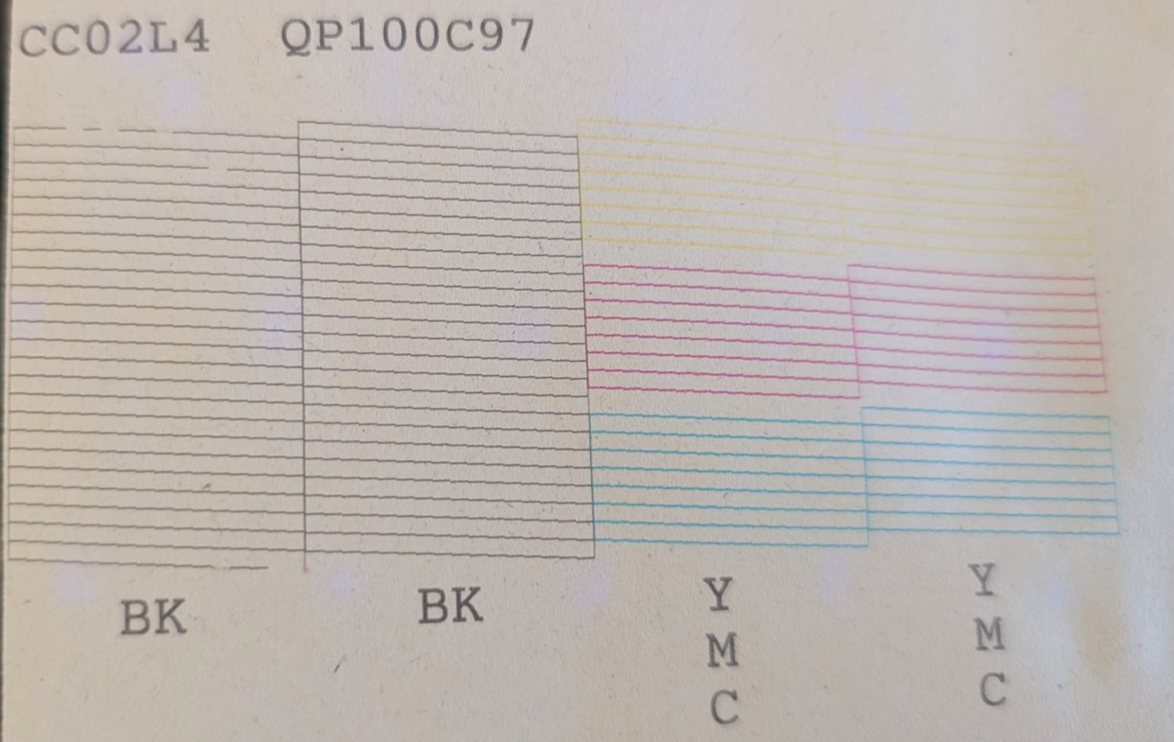Mittlerweile sind nur noch 15 schwarze Düsen frei von Farbe. Spülungen und Testdrucke alle 6-8 Stunden führten zu einem Ergebnis: