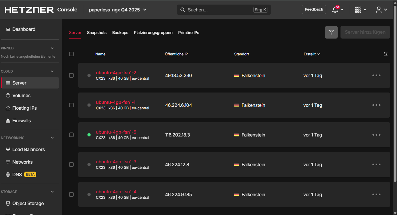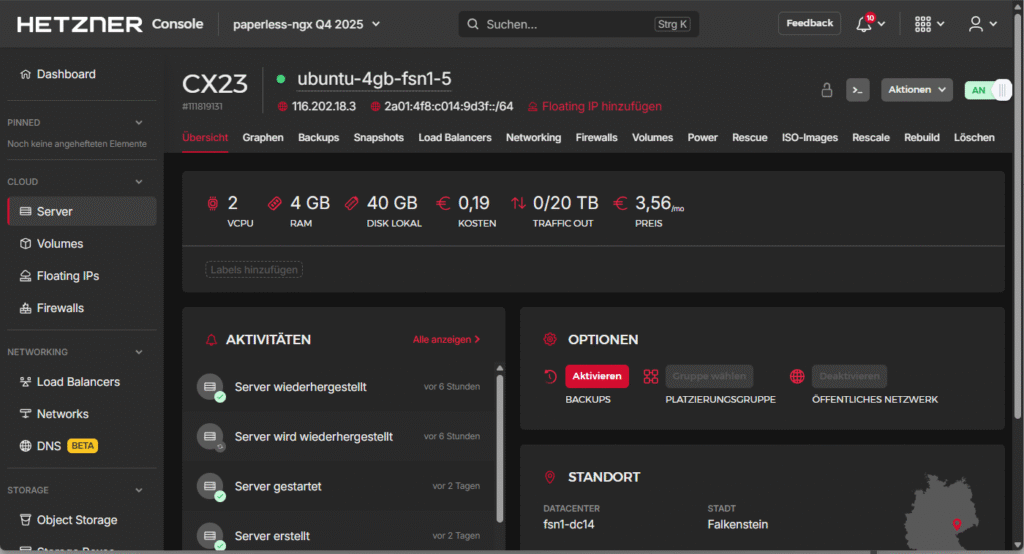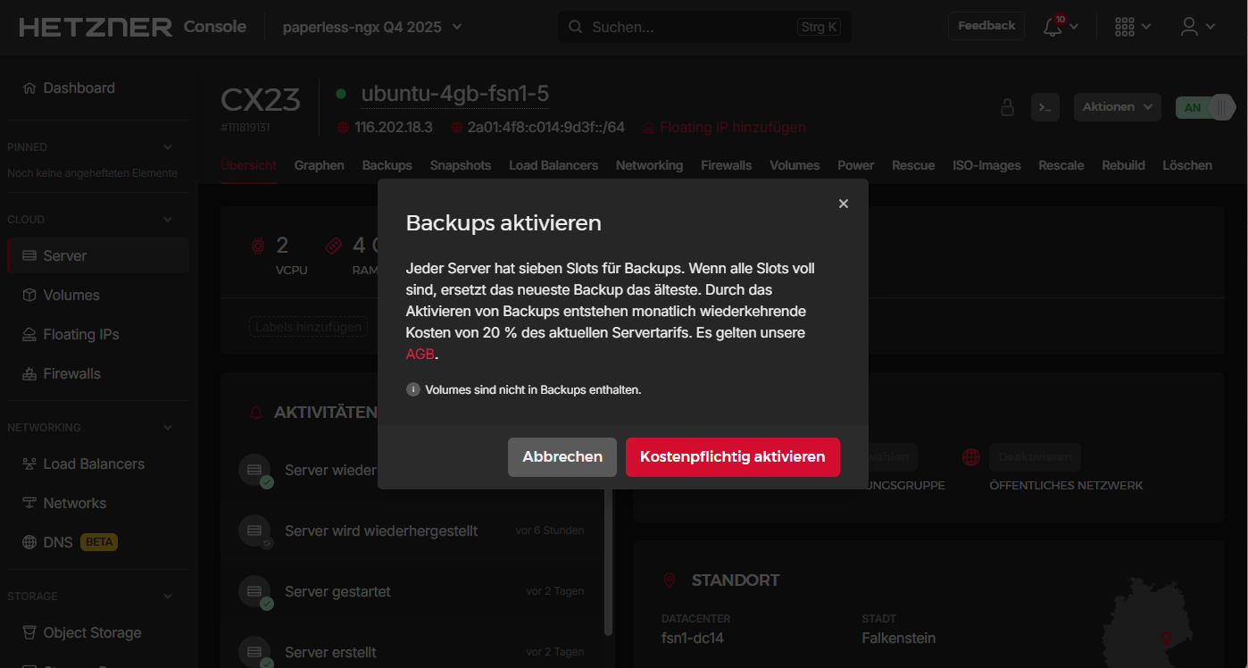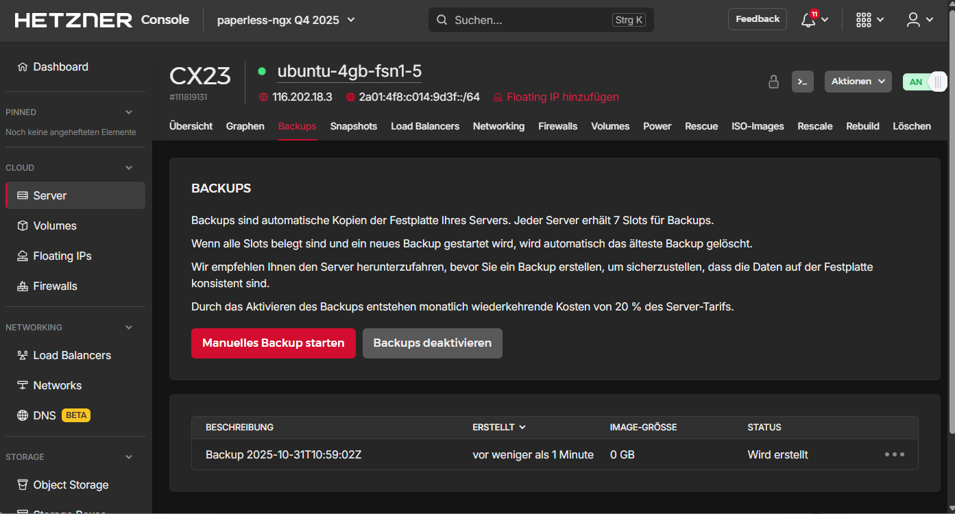Nachdem wir unsere paperless-ngx Installation auf dem Hetzner Cloud-Server installiert haben, sind Sicherungen unverzichtbar. Sie schützen uns vor möglichen Datenverlusten. In einer anderen Variante werde ich ein anbieterunabhängiges Backup beschreiben, in diesem Artikel nutzen wir die mit Abstand einfachste Variante: Tägliche Backups über die von Hetzner angebotene Infrastruktur.
